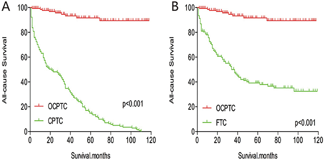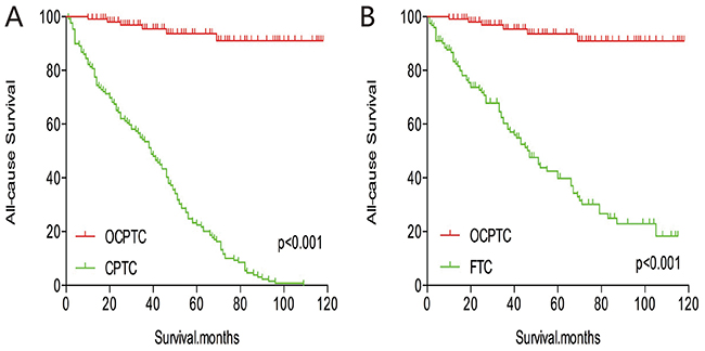 Figure 5: Kaplan Meier curves of all-cause mortality for matched Subtype pairs. Age, sex and race matching between OCPTC and CPTC (A), OCPTC and FTC (B) patients.