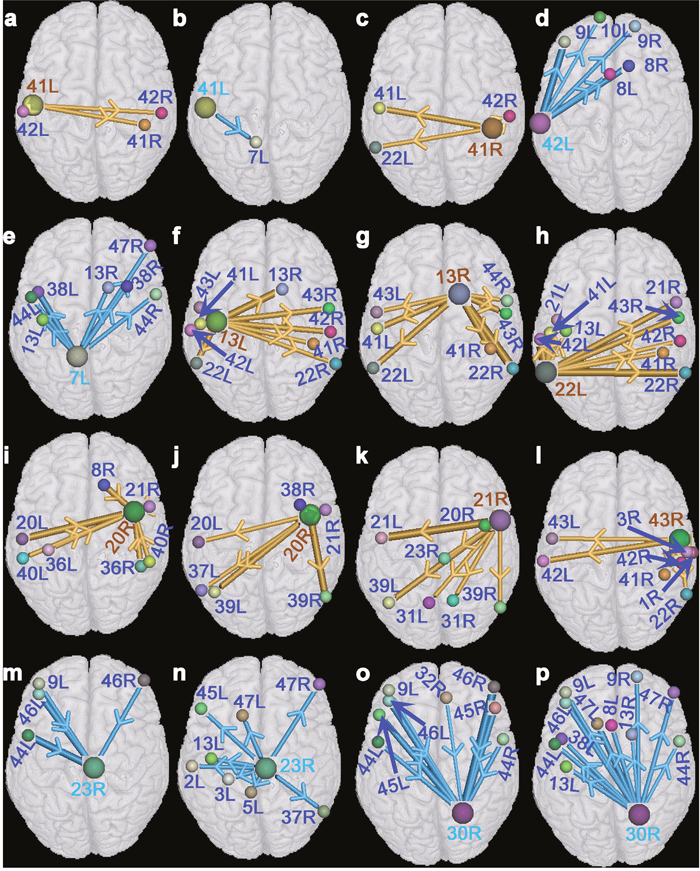 Figure 3: A diagram of input and output causal connections (two-sided, p<0.05, FDR corrected). (a, c, f, g, h, j, k, and l) denote the graphs of synchronous output causal connectivity of BAs 41L, 41R, 13L, 13R, 22L, 20R, 21R, and 43R, respectively. (b, d, e, n, and p) denote the graphs of asynchronous output causal connectivity of BAs 41L, 42L, 7L, 23R, and 30R, respectively. (i) denotes a graph of synchronous input causal connectivity of BA 20R. (m and o) denote the graphs of asynchronous input causal connectivity of BAs 23R and 30R, respectively. The gold bar denotes the synchronous causality connectivity, and the light blue bar denotes the asynchronous causality connectivity. The direction of the arrow denotes the direction of causality connectivity, and the diameter of the bar denotes the strength of the interregional causality connectivity. Abbreviations see Table 1 for details.