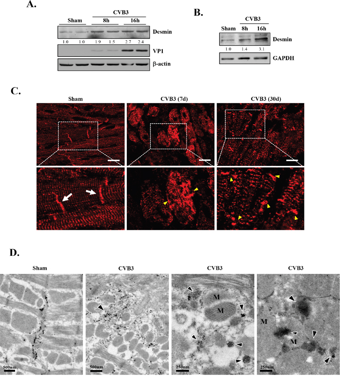 Figure 2: CVB3 infection leads to increased protein levels of desmin in vitro and results in the disruption of desmin structures in vivo. HL-1 murine cardiomyocytes (A) and rat primary neonatal cardiomyocytes (B) were sham- or CVB3-infected for 8 or 16 hours as indicated. Cell lysates were collected for western blot analysis of desmin and β-actin/GAPDH (loading control). (C) A/J mice were sham- or CVB3-infected for 7 or 30 days as indicated. Mouse hearts were harvested and immunofluorescent staining for desmin was carried out (red). Note that desmin in sham-infected mouse hearts is predominantly located on the Z lines and intercalated discs (white arrows). After CVB3 infection, the striated pattern of desmin is disrupted accompanied by the presence of granular-like aggregates (yellow arrowheads). Bar=10 μm. (D) A/J mice were sham- or CVB3-infected for 9 days and mouse hearts were harvested for immuno-electron microscopic study of desmin. Representative images are presented. Note the redistribution of desmin from the intercalated discs in the sham to the cytosolic electron dense aggregates (arrowheads) in CVB3-infected heart, as well as the disruption of mitochondrial structure and striated patterns of sarcomeres. M, mitochondria.