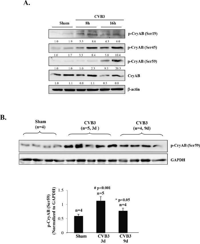 Figure 4: CVB3 infection results in phosphorylation of CryAB. (A) HL-1 mouse cardiomyocytes were sham-infected or infected with CVB3 for 8 or 16 hours as indicated. (B) A/J mice were sham- or CVB3-infected for 3 or 9 days as indicated. Cell or tissue lysates were collected for Western blot analysis of phospho-CryAB (p-CryAB), CryAB, and β-actin/GAPDH (loading control). Protein levels of p-CryAB were quantitated by densitometric analysis, normalized to β-actin or GAPDH, and presented as fold changes compared with sham (which was arbitrarily set a value of 1.0) in (A) or as mean ± SD in (B) lower panel.