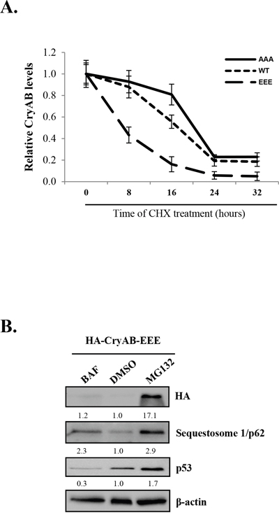 Figure 5: Phosphorylated CryAB exhibits reduced stability. (A) HL-1 mouse cardiomyocyteswere transduced with adenoviral HA-CryAB-WT, -AAA, or -EEE as indicated, followed by treatment with cycloheximide (CHX, 20μg/ml) for 0, 8, 16, 24 and 32 hours. Western blot analysis was performed and CryAB expression was quantitated by densitometric analysis, normalized to b-actin, and presented as fold changes compared with cells treated with cycloheximide at 0 hour, which was arbitrarily set a value of 1.0 (mean ± SD, n=3). (B) HL-1 cells transduced with HA-CryAB-EEE were treated with 20 nM bafilomycin A1 (BAF), vehicle (DMSO), or 4.0 μM MG132 for 48 hours and Western blot analysis was conducted for detection of HA-CryAB, p62, p53, and β-actin (loading control). Densitometric analysis was conducted as above and data are presented below each blot as fold changes compared with DMSO-treated control.