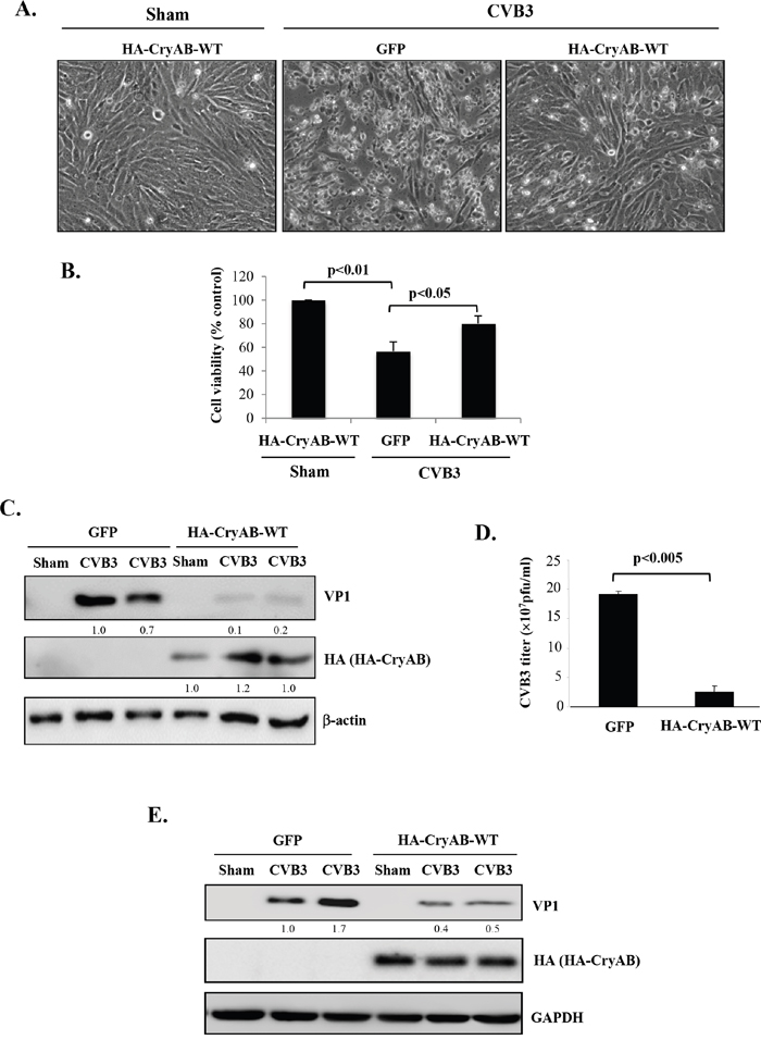 Figure 6: Overexpression of wild-type CryAB reduces CVB3 infection. HL-1 mouse cardiomyocytes (A-D) and rat neonatal cardiomyocytes (E) were transduced with adenoviral HA-CryAB-WT or control vector (GFP) for 48 hours, and then infected with CVB3 for 24 hours. (A) Representative images of sham and CVB3-infected HL-1 cells overexpressing HA-CryAB-WT or GFP control as indicated. (B) Cell viability was determined by the MTS assay and presented as percentage changes as compared with sham infection that was arbitrarily set as 100% (mean ± SD, n=3). (C, E) Western blotting was carried out to examine protein levels of viral capsid protein VP1, HA-tagged CryAB, and β-actin/GAPDH (loading control) in HL-1 (C) and rat neonatal cardiomyocytes (E). VP1 levels were quantitated by densitometric analysis, normalized to β-actin, and presented underneath as fold changes compared with the GFP-transduced, CVB3-infected cells. (D) Plaque assay was performed to measure CVB3 viral progeny titer in supernatants collected from CVB3-infected HL-1 cells transduced with HA-CryAB-WT or GFP control vector (mean ± SD, n=3).