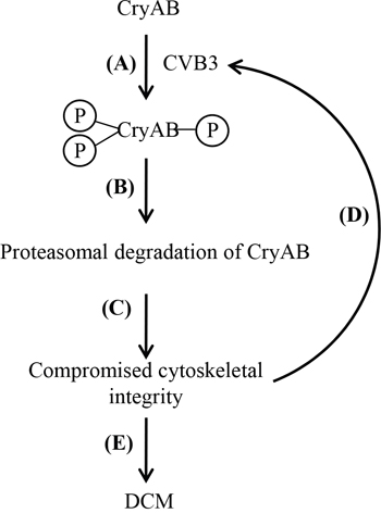 Figure 7: Proposed function and mechanism of CVB3-mediated CryAB dysregulation in the development of viral cardiomyopathy. Upon CVB3 infection, CryAB is phosphorylated at residues serine-19, -45 and -59 (A). Phosphorylated CryAB is then targeted for proteasomal degradation (B), which leads to impaired cytoskeletal integrity (C), contributing to increased viral propagation (D), and ultimate DCM (E).