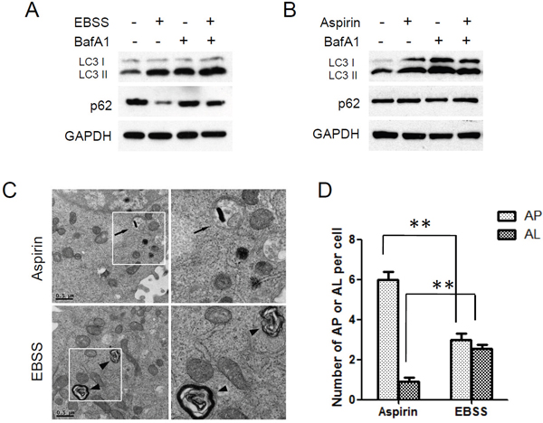Figure 2: Autophagic degradation was blocked in aspirin treated SW480 cells. (A) HCT116 cells were treated with EBSS for 4 h after cells were pretreated with 100 nM Bafilomycin A1 for 2 h. (B) HCT116 cells were treated with aspirin 5mM for 24 h after cells were pretreated with 100 nM BafilomycinA1 for 2 h. Levels of LC3 and p62 were evaluated by western blotting. GAPDH was used as loading control. (C) Electron microscopy analysis of autophagosomes and autolysosomes. HCT116 cells treated with EBSS or Aspirin were subjected to electron microscopy analysis. The arrows indicate autophagosomes (AP) and the arrowheads indicate autolysosomes (AL). Scale bar, 0.5μm. (D) Quantitation of AP and AL in HCT116 cells as in C. Bar are mean ± SEM of 20 cells; three independent experiments, **P< 0.01 (Student’s t-test).