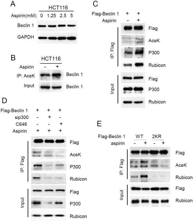 Figure 3: Aspirin enhanced p300-mediated Beclin 1 acetylation on lysine 430 and 437. (A) HCT116 cells were treated with different concentration of aspirin for 24 h. Protein levels of Beclin 1 were estimated using western blot analysis. GAPDH was used as loading control. (B) Acetylated proteins were immunoprecipitated with the antibody to acetylated lysine from HCT116 cells after aspirin treatment. Acetylation of endogenous Beclin 1 protein was analyzed with western bolt. (C) Flag-tagged Beclin 1 was transfected into HCT116 cells. Then the transfected cells were treated with DMSO or 5mM aspirin for 24 h. Acetylation of exogenous Beclin 1 protein was analysed with IP and western bolt. (D) Flag-tagged Beclin 1 was transfected into HCT116 cells, in another group, flag-tagged Beclin 1 was co-transfected with sip300. Then the transfected cells were treated with aspirin DMSO or C646. (E) Flag-tagged Beclin 1 (WT, 2KR) was transfected into HCT116 cells, then the transfected cells were treated with DMSO or 30μM C646 for 24 h. Beclin 1 acetylation and the interaction between Beclin 1 and p300 or Rubicon was determined with IP and western blot analyses.