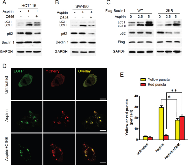 Figure 4: Aspirin-mediated Beclin 1 acetylation inhibits autophagic degradation. (A-B) HCT116 and SW480 cells were treated with or without 30μM C646 in the presence or absence of 5mM aspirin for 24 h, and western blot analyse of LC3, p62 and Beclin 1 were performed. (C) Flag-tagged Beclin 1 (WT, 2KR) was transfected into HCT116 cells, then the transfected cells were treated with different concentration of aspirin for 24 h. Western blot analyses of LC3 and p62 were performed. (D) HCT116 cells transfected with mCherry-EGFP-LC3 were treated with or without 30μM C646 in the presence of 5mM aspirin for 24 h. Scale bars, 5μm. (E) Quantitation of red and yellow puncta in D. Bars represent mean ± SEM of 50 cells; three independent experiments, *P<0.05, **P<0.01 (Student’s t-test).
