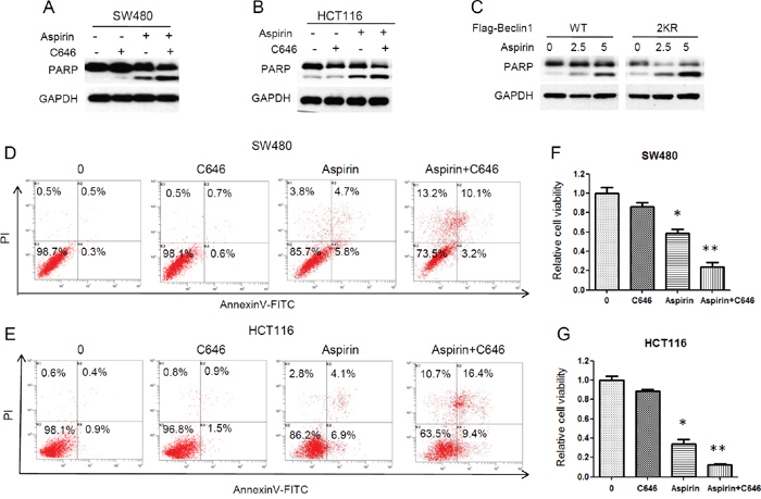 To further determine the effect of Beclin 1 acetylation on aspirin-induced apoptosis, we inhibited Beclin 1 acetylation by C646 in aspirin treated CRC cells. Combination with C646 resulted in more cleavage of PARP than aspirin only in HCT116 and SW480 cells (Figure 5A, 5B). Aspirin also induced more cleavage of PARP in the Beclin 1-2KR expressing cells than cells expressing wide-type Beclin 1 (Figure 5C). Annexin V/PI apoptosis assay was performed by flow cytometer. Combination C646 with aspirin resulted in obviously more apoptosis in HCT116 and SW480 cells than aspirin treatment only and C646 itself nearly induced no apoptosis in CRC cells (Figure 5D, 5E). It is worth noting that combination C646 with aspirin resulted in some non-apoptotic cell death (Annexin V-/PI+). These findings suggested that, besides apoptosis, autophagy also takes part in the aspirin-mediated cell death in CRC cells.
