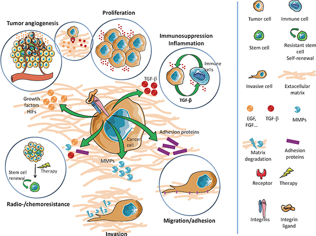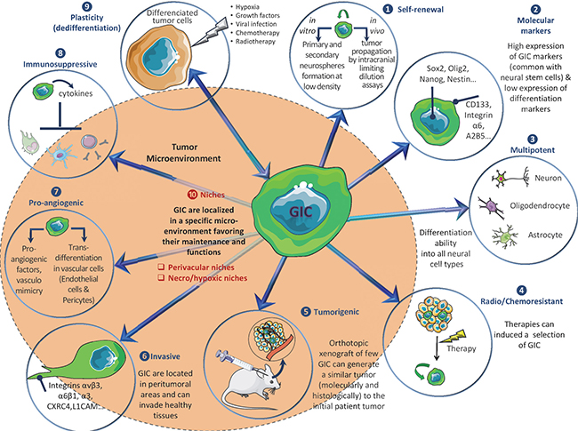 GIC are characterized by their ability to self-renew in vitro (as neurosphere 3D structures) and in vivo, their marked expression of stem markers (CD133, Nestin, Olig2, Sox2, Nanog, BMI1, A2B5, ITGA6, L1CAM…), their multipotent aptitude to differentiate into neuronal, astrocytic or oligodendrocytic lineages, and a higher tumorigenic potential in orthotopically xenografted athymic nude mice [7]. Of note, it appears that the GIC subpopulation is strongly heterogeneous and could not be defined by the expression of an unique marker, but rather by a combination of markers. For example, it was previously shown that CD133-negative GB cells could also be identified as tumorigenic GIC [8]. Furthermore, GIC are particularly aggressive, invasive, radio/chemoresistant [7, 9] and display high autophagic capacities that may participate to these resistance processes [10]. GIC participate to angiogenesis via pro-angiogenic factor synthesis, cooperation with endothelial cells (EC), vasculogenesis by vasculogenic mimicry formation and transdifferentiation into pericytes or EC (for review [11]). GIC can also induce immunosuppression, notably via cytokines secretion [12]. Moreover, several signals and stresses, such as hypoxia [13], specific growth factors [14, 15], viral infections [16], chemotherapy [17] and ionizing radiations [9] contribute to the generation/amplification of GIC population from more differentiated GB cells, a process, which can evoke a possible cancer cell dedifferentiation or reprogramming [18]. Collectively these properties (Figure 1) suggest that targeting GIC represents a therapeutic interest in GB. To this end, blockade of specific pathways identified in GIC maintenance and functions (Notch, Sonic Hedgehog/Wnt, Akt…) may be a valuable strategy [7], but could lack efficiency due to compensatory pathways. Another alternative to eradicate GIC could be the targeting of their niches. Actually, GIC preferentially reside in perivascular and necro/hypoxic niches where they closely interact with the microenvironment [19]. These interactions with microenvironment elements, like stromal cells or extracellular matrix (ECM) components, seem to be critical for GIC maintenance, notably through metabolic and/or epigenetic modifications [19, 20] and could constitute a putative target.