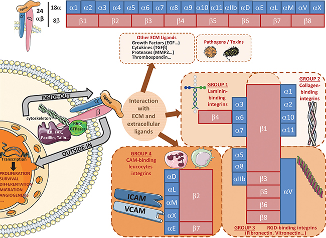 Key components of the dialogue between cells and the microenvironment, integrins (ITG) are composed of two non-covalently associated α and β subunits, which are characterized by a large extracellular domain, a short transmembrane domain and a small intracellular non-catalytic cytoplasmic tail [21]. To date, 18 α and 8 β subunits have been identified in humans and form at least 24 unique heterodimers. Each α/β combination determines specific integrin binding ability and functions. Structural characteristics and ligands of these heterodimeric glycoproteins have already been reviewed [22] and are summarized in Figure 2. These receptors play a role in the regulation of cell adhesion to ECM proteins or cell surface proteins (immune cells, platelets…) [22]. They are central regulators, which act as transmembrane links between extracellular contacts and intracellular cytoskeleton via a bidirectional signalling. First, upon extracellular ligands binding, integrins cluster in the membrane and transduce intracellular signals through their cytoplasmic domain (mostly via β subunit) by activation of kinases (Focal Adhesion Kinase (FAK), Integrin-Linked Kinase (ILK)…) or Rho-GTPases. Integrins can then activate pathways leading to gene transcription to sustain proliferation, survival, differentiation and migration (outside-in signalling) [22, 23]. Second, cytoplasmic proteins can also modulate integrins extracellular affinity for their ligands (inside-out signalling). In addition, integrins also bind cytoskeleton proteins (α-actinin, tensin, vinculin, talin, paxillin, intermediate filaments…) and, then, are involved in structural cell functions. All these characteristics (Figure 2) may confer a high degree of complexity and flexibility in integrin-linked cell functions and signalling pathways, since several distinct integrins can be expressed on specific cells and, depending on context generate dramatically different responses. As a consequence, integrin-pathways alterations have also been linked to several pathologies, such as auto-immune and thrombotic diseases, ischemic brain injury, inflammation, fibrosis and cancer.