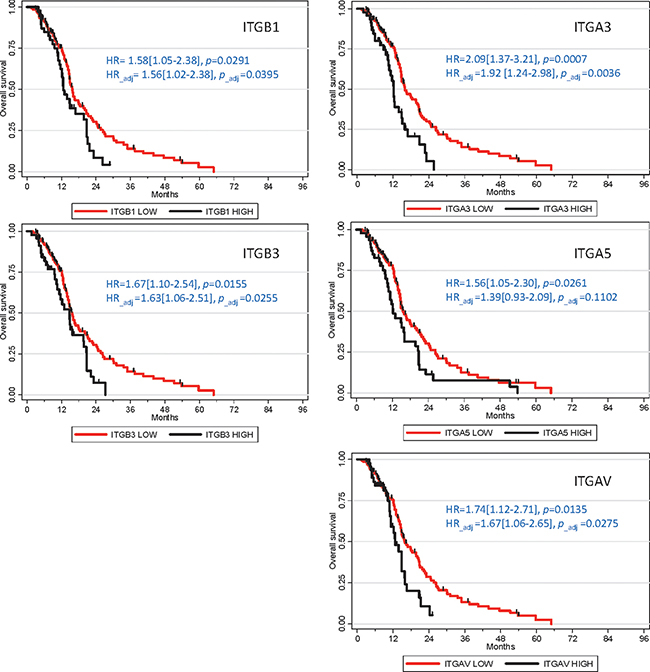 Figure 3: Integrins overexpression association with poor prognosis in GB patients. Kaplan-Meier survival plots were established using TCGA Affymetrix dataset (n = 184). Hazard ratios (HR) and p-values were given for univariate analyses. Adjusted HR and p-values were calculated for multivariate analyses, in relation to other prognostic clinical covariates (Age, G-CIMP status and Karnofsky score).