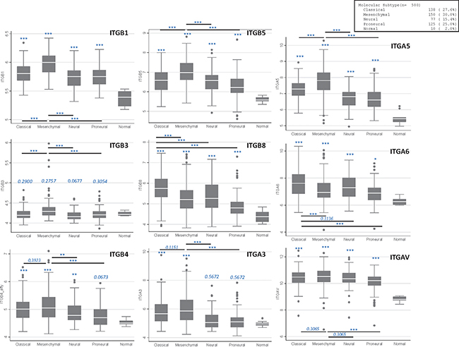 Figure 4: Main integrins expression in GB samples according to molecular subtypes. Plots were established using TCGA Affymetrix dataset (n = 500). *p ≤ 0.05; ** p ≤ 0.01; ***p ≤ 0.001. When not stated, values are compared to the “normal” subgroup.