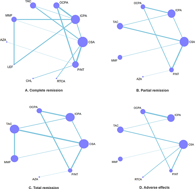 Our efficacy analyses included 730 patients with a CR in 17 trials examining a total of ten treatments (Figure 3A), 569 patients with a PR in 12 trials examining a total of seven treatments (Figure 3B), and 605 TR patients in 12 trials examining a total of seven treatments (Figure 3C). Our safety analyses based on the incidence of ASEs included 730 patients in 11 trials examining a total of seven treatments (Figure 3D). Ultimately, the following nine treatments were analyzed relative to P/NT in the present meta-analysis: cyclosporin (7 trials), i.v. cyclophosphamide (3 trials), tacrolimus (4 trials), MMF (3 trials), oral cyclophosphamide (5 trials), leflunomide (1 trial), chlorambucil (1 trial), azathioprine (1 trials), and rituximab-cyclosporin dual therapy (1 trial).