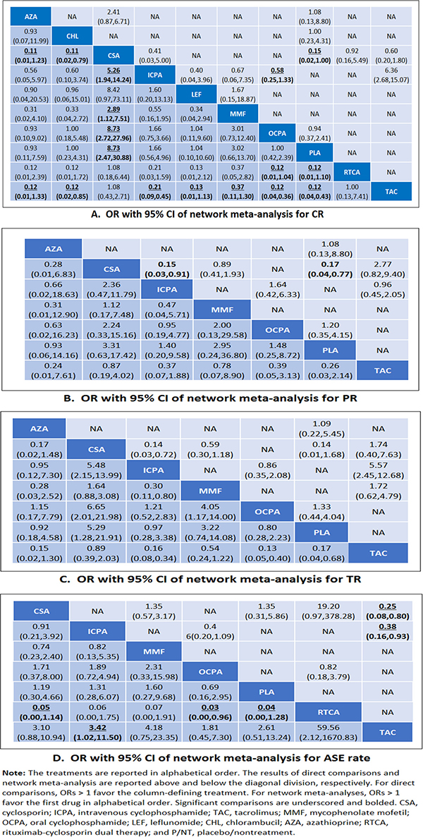 Our network meta-analysis results for immunosuppressive medications, active comparators, and P/NT are presented in Figure 4. Tacrolimus was found to be more efficacious for achieving CR than i.v. cyclophosphamide, MMF, oral cyclophosphamide, leflunomide, chlorambucil, and azathioprine, as well as P/NT. Tacrolimus was also found to be more efficacious for achieving TR than i.v. cyclophosphamide, oral cyclophosphamide, azathioprine, and P/NT. Meanwhile, cyclosporin therapy was associated with a better CR rate than i.v. cyclophosphamide, MMF, oral cyclophosphamide, chlorambucil, azathioprine, or P/NT. Cyclosporin was more likely to yield more TR outcomes than i.v. cyclophosphamide, oral cyclophosphamide, or P/NT. Additionally, rituximab-cyclosporin dual therapy was more efficacious for obtaining CR than oral cyclophosphamide or P/NT, and MMF more efficacious in terms of TR than either i.v. cyclophosphamide or oral cyclophosphamide. However, in terms of safety, tacrolimus use was less likely to result in ASEs than i.v. cyclophosphamide or rituximab-cyclosporin dual therapy. Meanwhile, rituximab-cyclosporin dual therapy was associated with a greater likelihood of ASEs than oral cyclophosphamide, cyclosporin, or P/NT (95% CI for OR slightly more than 1).