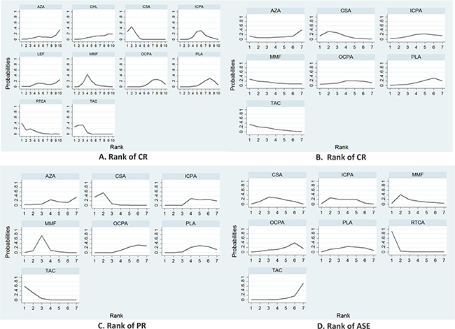 Figure 5: Efficacy and safety outcome rankings. CR (A), PR (B), TR (C) and ASE (D) rankings reflect the probability of being the best, second best, etc., treatment among the treatments compared.