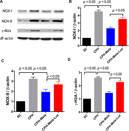 Figure 5: Changes in protein expressions of oxidative and DNA damage markers at 30 days in mice with chronic cerebral hypoperfusion. (A) Illustration of Western blot results of ROS (i.e., NOX-I and NOX-II) and r-H2A. (B) Protein expression of NOX-I; (C) Protein expression of NOX-II;. (D) Protein expression of r-H2A; All statistical analyses using one-way ANOVA, followed by Bonferroni multiple comparison post hoc test. The p < 0.05 indicates statistical significance between two groups. SC = sham control; CHP = cerebral hypoperfusion; CHP-Mela = cerebral hypoperfusion with melatonin (10 mg/kg/day,ip); CHP-Mela-Luz = cerebral hypoperfusion with melatonin (10 mg/kg/day, ip) and luzindole (30 mg/kg, ip).