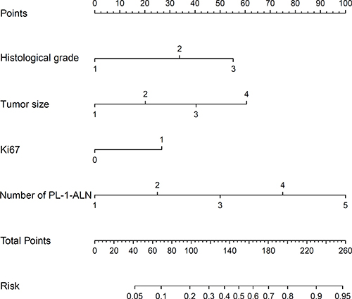 Figure 1: Nomogram for predicting the probability of L-2-ALNM. The nomogram has seven rows. The first row is the point assignment for each variable. For each individual patient, each variable is assigned a point value in accordance with the clinicopathological characteristics by delineating a vertical line between the exact variable value and the points line. Thereafter, the Total Points (row 6) can be obtained by summing all of the assigned points for the four variables. Finally, the predictive probability of axillary metastasis can be acquired by drawing a vertical line between Total Points and Risk (the final row).