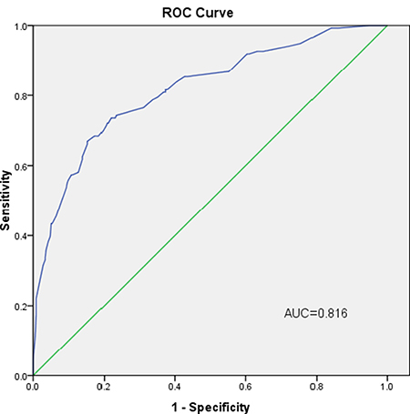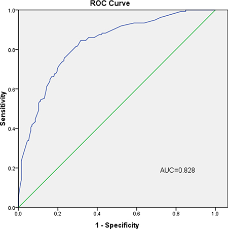 Figure 2: Internal validation using a ROC curve. The AUC value is 0.828 (95% CI: 0.788–0.868).