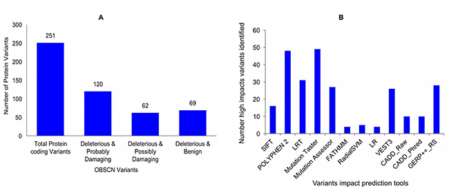 Figure 9: (A) SIFT and POLYPHEN-2 programs were used to predict the most common and significant OBSCN mutational impact variants; (B) To validate the high-impact variants and their mutations impact are predicted using 10 potential impact prediction tools.