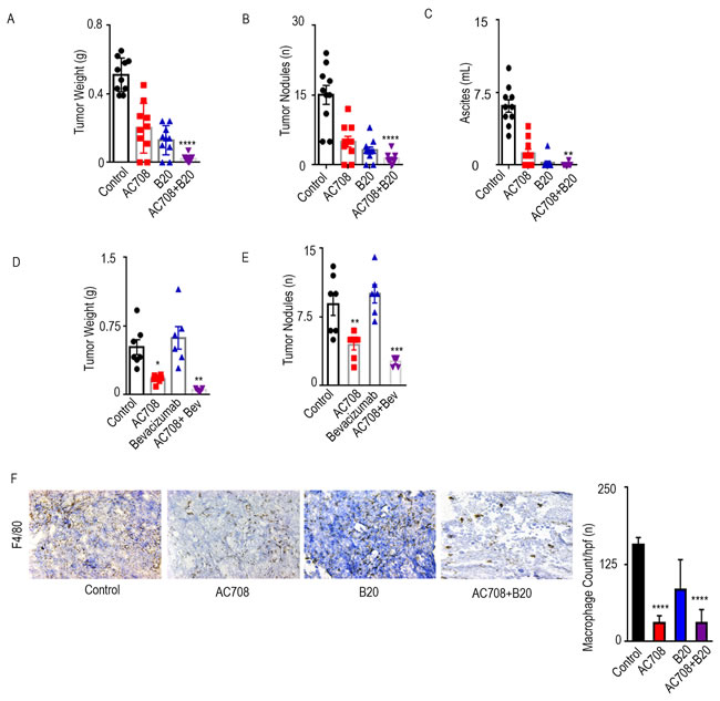 Figure 1: AC708 combined with B20 decreases tumor burden in syngeneic and PDX mouse models. C57Bl/6 mice received IG10 murine ovarian cancer cells by intraperitoneal injection and were randomly assigned to treatment with AC708, B20, or the combination. Bar graphs show the tumor weight, tumor nodules, and volume of ascites A.-C. NOD-SCID mice were injected intraperitoneally with ascites from a patient with HGSC and randomly assigned to treatment with AC708, bevacizumab, or the combination. Tumor weight and number of nodules are shown D.-E. IG10 tumor samples from all groups were stained for F4/80 and total macrophage count was compared between groups F.. The bar graph represents mean number of macrophages from 5 randomly selected high power fields at 20x high power. * denotes p≤0.05, ** denotes p≤0.01, *** denotes p≤0.001, and **** denotes p≤0.0001.
