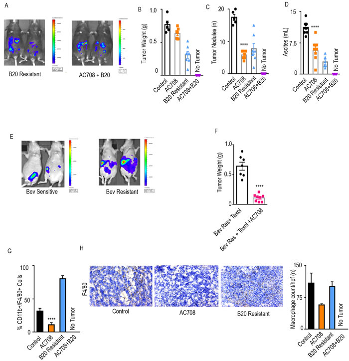 Figure 2: AC708 reduces tumor burden in setting of adaptive resistance to anti-VEGF therapy. Bioluminescent signal differences between B20 resistant mice with and without the addition of AC708 are shown. Automatic exposure time was used A.. Tumor weight, tumor nodules, and volume of ascites B.-D. are shown in IG10 murine ovarian cancer model of adaptive resistance treated with AC708, B20, or the combination, after resistance was determined by bioluminescent imaging. E. demonstrates bioluminescence imaging differences in those mice sensitive versus resistant to treatment with bevacizumab and paclitaxel in OVCAR432 HGSC model. Automatic exposure was time was used. Tumor weight of the OVCAR432 model shown in groups resistant to bevacizumab, plus paclitaxel, with and without AC708 F.. G. Quantification of macrophages from IG10 model treated with AC708, B20, or the combination in the setting of adaptive resistance. Macrophage content was determined by the percentage of CD11b+/F4/80+ cells out of CD45+ cells, using flow cytometry. The same groups were also stained for F4/80 via immunohistochemistry to quantify macrophages H.. **** denotes p≤0.0001.