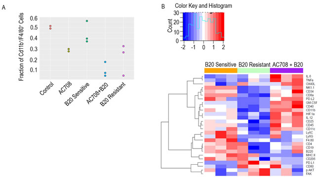 To understand the potential mechanisms underlying the response to therapy, we next set up another adaptive resistance model using the IG10 cell line in order to proceed with comprehensive immune profiling. At the completion of the adaptive resistance experiment in the syngeneic mouse model, immune cells were isolated from fresh tumor tissue from 5 groups: 1) control, 2) B20 sensitive, 3) AC708, 4) B20 resistant, 5) B20 resistant + AC708. The tissue was processed, stained, and subjected to profiling using cytometry by time-of-flight (intracellular and surface markers are listed in Supplementary Table 1). Compared to control samples and those determined to be resistant to B20, tumors from the AC708-only treated mice and the B20 resistant plus AC708 treated tumors had decreased macrophages, as determined by the fraction of CD11b+/F4/80+ cells in all CD45+ live cells (Figure 3A). Both groups treated with AC708 showed a significant decrease in macrophages when compared to the untreated groups (p ≤ 0.05). Figure 3B represents the expression profile of all the myeloid markers in the macrophage population across all groups. PD-L1, p-AKT, and FAK expression were elevated in samples resistant to B20, while the expression of these markers was decreased once AC708 was added to B20 resistant mice.