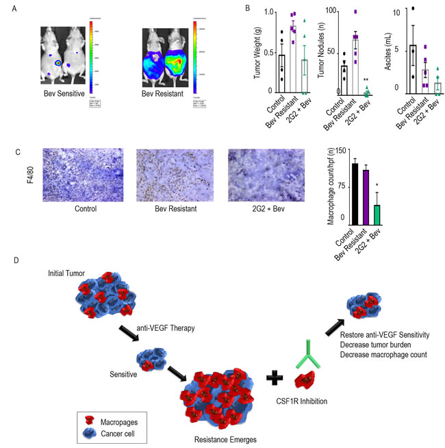 To test for consistency of effect, we also tested the efficacy of a CSF1R targeted mouse monoclonal antibody, 2G2, in combination with bevacizumab [7]. Nude mice were injected intraperitoneally with HGSC cell line, OVCAR5. Treatment groups were similar to those described previously, 1) control, 2) bevacizumab, and 3) 2G2, beginning on day 21. Mice were imaged via IVIS every week and then separated into sensitive and resistant to bevacizumab, based on bioluminescence imaging (Figure 4A). Consistent with the experiments described above, the addition of 2G2 to anti-VEGF therapy at the point of bevacizumab resistance improved outcomes in tumor burden, tumor nodules, and ascites (Figure 4B). Tumor weight was decreased by 51%, tumor nodules by 92%, and ascites by 55%. Macrophage count, as determined by F4/80 staining, was significantly decreased by 64% in the group that received 2G2 at the emergence of bevacizumab resistance, compared to the bevacizumab only group (Figure 4C).