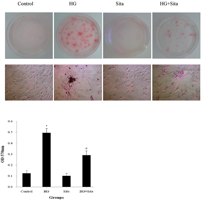 Figure 6: Sitagliptin (Sita) inhibited HG-induced calcification in VSMCs. Calcification of cultured VSMCs was determined with alizarin red staining after HG culture for 14 days (400× magnification). *P<0.01 vs. control; #p<0.01 vs. HG. HG, high glucose; Sita, Sitagliptin.