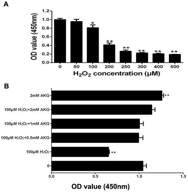 Figure 1: Cell proliferation in IPEC-J2 cells. (A) Effects of increasing concentrations of H2O2 for 4h on cell proliferation; (B) Effects of addition of increasing concentrations of AKG from 0 to 2 mM to 100 μM H2O2 for 2 days on cell proliferation. Cell viability was quantified by CCK-8 assay. Data are expressed as means ± SEM of at least three independent experiments. *P < 0.05 and **P < 0.01.