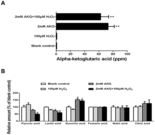 Figure 7: The TCA cycle intermediates, pyruvic acid, and lactic acid of IPEC-J2 cells. Cells were treated without (Blank control) or with 100 μM H2O2, 2 mM AKG, or 100 μM H2O2 plus 2 mM AKG, respectively. (A) Cellular AKG was determined. (B) Concentrations of pyruvic acid, lactic acid, and the TCA cycle intermediates (succinic acid, fumaric acid, malic acid, and citric acid) were determined. Data are expressed as means ± SEM of at least three independent experiments. *P < 0.05 and **P < 0.01.