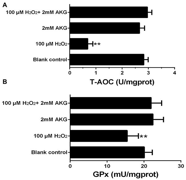 Figure 8: Concentrations of T-AOC and GPx in the IPEC-J2 cells. Cells were treated without (Blank control) or with 100 μM H2O2, 2 mM AKG, or 100 μM H2O2 plus 2 mM AKG, respectively. (A) T-AOC content was determined. (B) GPx content was determined. Data are expressed as means ± SEM of at least three independent experiments. *P < 0.05 and **P < 0.01.