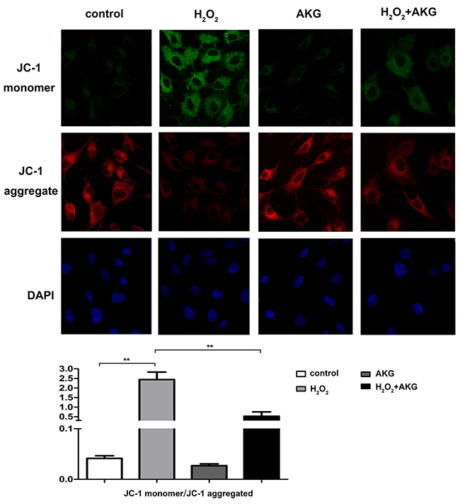 Figure 9: Mitochondrial membrane potential (MMP) of treated cells. Cells were treated without (Blank control) or with 100 μM H2O2, 2 mM AKG, or 100 μM H2O2 plus 2 mM AKG, respectively. Representative images of JC-1 derived fluorescence in IPEC-J2 with different treatment (400×). The JC-1 monomer was represented with green fluorescence; the JC-1 aggregate image was represented with red fluorescence; the merged images were the combined of the green and red images; The nucleus was stained with DAPI working solution before the photos capture; (A) Captured photos are shown. (B) Relative ratio of green fluorescence to red fluorescence. Mitochondrial depolarization is indicated by an increase in the green/red fluorescence intensity ratio. Data are expressed as means ± SEM of at least three independent experiments. *P < 0.05 and **P < 0.01.