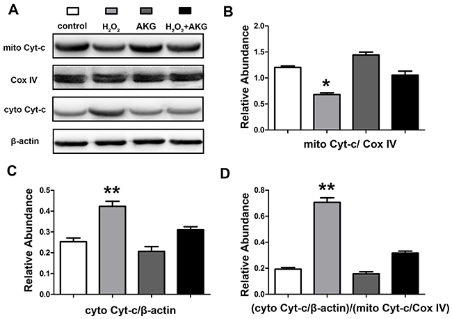 To furtherly verify whether alpha-ketoglutarate protected H2O2-induced apoptosis in IPEC-J2 via a mitochondrial dependent pathway, we determined the profiles of MMP and release of mitochondrial cytochrome c in treated cells. For this JC-1 fluorescence staining, lower intensity of red fluorescence along with the increase of green fluorescence indicate a decrease of MMP and the mitochondrial dependent apoptotic process. Figure 9 showed an increase in green/red fluorescence ratio induced by H2O2 was counteracted by AKG addition. Treatment with H2O2 for 4 h may induce the damage of mitochondria, thereby resulting in the release of mitochondrial cytochrome c to the cytoplasm. As shown in Figure 10, the release of cytochrome c was elevated (P < 0.05) by H2O2 treatment and was decreased by AKG. These results indicate that AKG inhibits H2O2-induced apoptosis via maintaining MMP stabilization, and decreasing the release of mitochondrial cytochrome c.