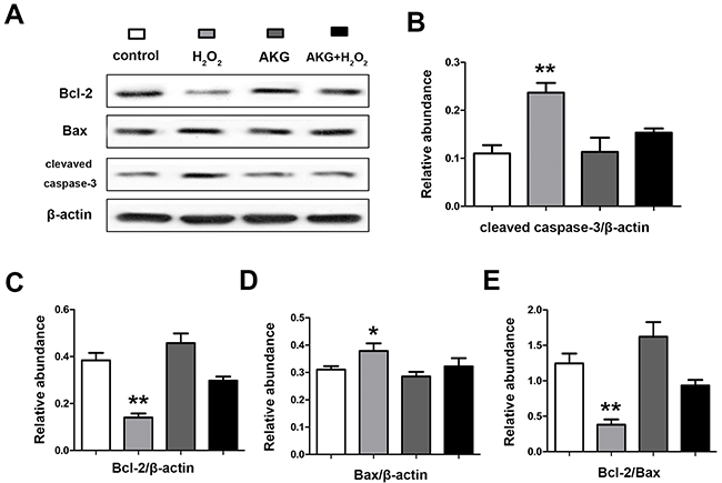 Figure 11: Abundances of apoptosis associated proteins in IPEC-J2 cells determined by western blot analysis. Cells were treated without (Blank control) or with 100 μM H2O2, 2 mM AKG, or 100 μM H2O2 plus 2 mM AKG, respectively. Protein levels of Bcal-2, Bax, cleaved caspase-3 were determined by western blot. (A) Protein bands of Bcl-2, Bax, cleaved capase-3 and β-actin are shown. (B) Relative abundance of cleaved caspase-3. (C) Relative abundance of Bcl-2. (D) Relative abundance of Bax. (E) The relative ratio of Bcal-2 to Bax protein is shown. Data are expressed as means ± SEM of at least three independent experiments. *P < 0.05 and **P < 0.01.