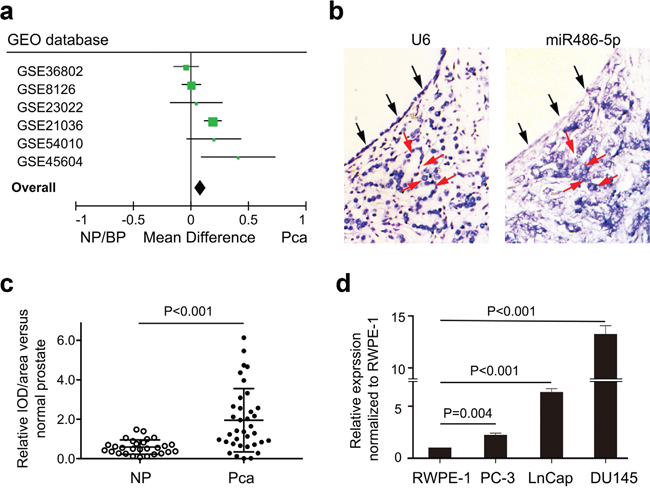Figure 1: Up-regulation of miR-486-5p expression in prostate cancer patients and cell lines. (a) Meta-analysis of the six groups profiles of microRNA in prostate cancer from GEO datasets. (b) In situ hybridization (ISH) showed overexpression of miR-486-5p in cancer tissues (red arrow) compared to benign tissue (black arrow). (c) The statistic analysis of miR-486-5p relative expression in ISH. The relative value was calculated by the Image-Pro Plus software. NP, normal prostate tissue; Pca, prostate cancer tissue. (d) Up-regulation of miR-486-5p expression was validated in three prostate cancer cell lines by real-time PCR using U6 as control.