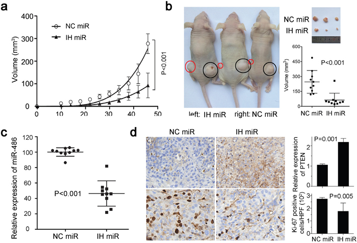 Figure 3: MiR-486-5p affects tumor growth in xenograft model. (a) Tumor growth in nude mice subcutaneous injected into the two flanks with Du145 cells transfected with IH miR or NC miR. Datas are represented as mean ± SD (n=10). The curves represented the trend of the tumor size increase. (b) Comparison of tumor engraftment sizes in nude mice injected with Du145 cells transfected with IH miR or NC miR. The tumor were marked by the red and black circles on the nud mice. (c) MiR-486-5p expression in xenografts with IH miR or NC miR was measured by qPCR. (d) Immunohistochemistry showed PTEN and Ki67 expressions in xenografts with IH miR or NC miR.