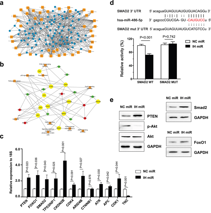 Figure 4: Target genes of miR-486-5p were screened and analysed. (a) RNA sequencing showed that regulated genes were involed in numberous pathways, including PTEN/PI3K/Akt, FOXO1 and TGFβ/SMAD2 pathways. (b) After analyseing the results of RNA sequencing and target bioinformatic prediction, we focused on 11 genes which were considered as key targets and also involved in the preferential pathways. (c) The regulation of the 11 possible “driver” genes was validated in DU145 cell lines by real-time PCR. (d) SMAD2 3’UTR contains predicted miR-486-5p binding sites. The figure show alignment of miR-486-5p with SMAD2 3’UTR and the dotted line indicate the mutagenesis nucleotides. Luciferase reporter constructs containing wild-type or mutated SMAD2 3’UTR was cotransfected with IH miR and NC miR into Du145 cells. Relative firefly luciferase expression was normalized to Renilla luciferase. (e) Effect of miR-486-5p on PTEN/PI3K/Akt, FOXO1 and TGFβ/SMAD2 pathways. Du145 cells were transfected with IH miR and NC miR for 72 h, total proteins were prepared for Western blot.