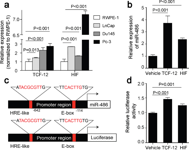 Figure 5: HIF1a and TCF12 mediate miR-486-5p induction in prostate cancer. (a) Up-regulation of HIF1a and TCF12 was validated in three prostate cancer cell lines by real-time PCR. (b) Overexpressed HIF1a and TCF12 inducted overexpression of miR-486-5p in Du145 cells using vehicle plasmid as control. (c) Upper panel: miR-6486-5p promoter region harboring HRE binding site and E-box. Lower panels: Promoter reporter vectors containing the miR-486-5p promoter with HRE binding site and E-box upstream of luciferase gene. The core DNA binding sequence of HRE binding site and E-box is highlighted in red. (d) The luciferase promoter reporter vector containing the promoter region sequence was transfected into HeLa cells. Overexpressing the TCF12 and HIF-1a caused a significant induction of luciferase activity.