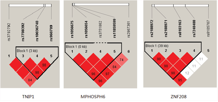 Figure 1: Haplotype block map for the TNIP1, MPHOSPH6 and ZNF208 SNPs genotyped in this study.