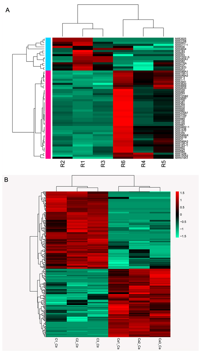 Figure 1: Heatmap of RNA sequencing data. (A) Expression profiles of differentially expressed miRNAs in patients and controls; (B) Expression profiles of differentially expressed circRNAs in patients and controls