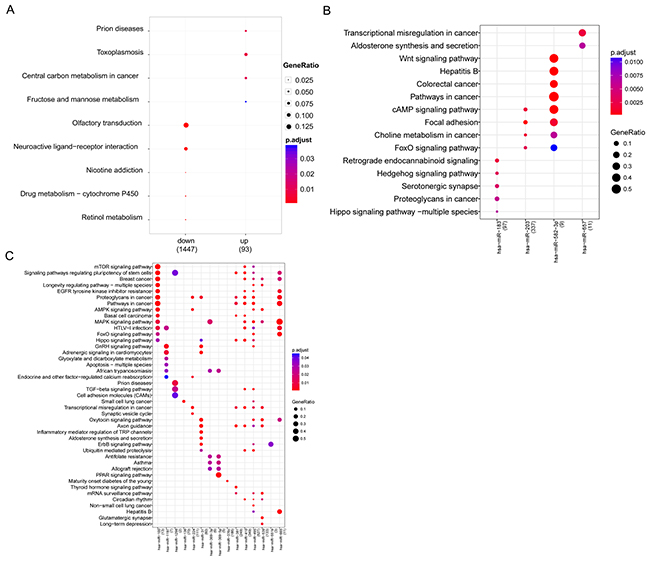 Figure 2: Bubble diagram of significant enrichment of pathways. (A) Pathways enriched by up- and down-regulated genes; (B) Significant pathways for up-regulated miRNAs; (C) Significant pathways for down-regulated miRNAs.