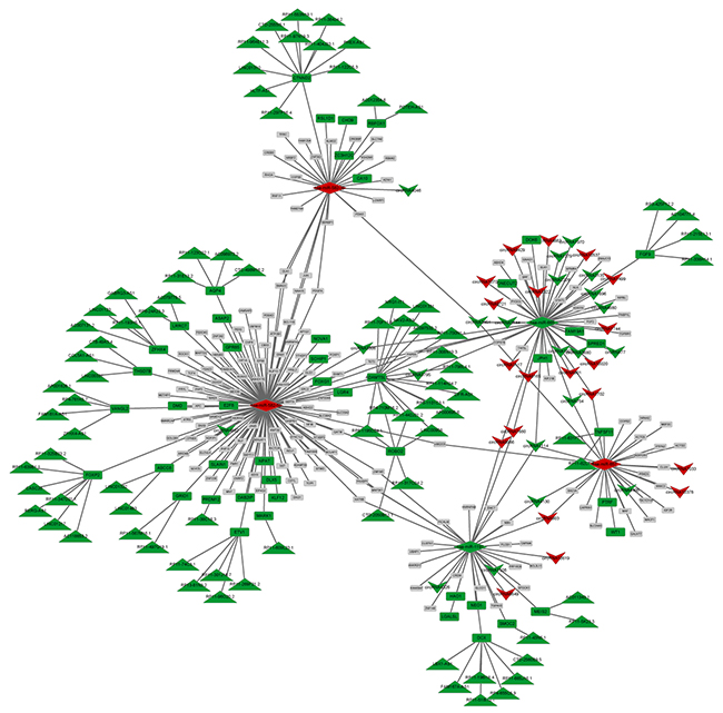 Figure 3: CeRNA network combined with miRNA, circRNA, lncRNA, and mRNA. Green: down-regulation; Red: up-regulation; Gray: non-differential expression. Upsidedown triangle: circRNA, diamond: miRNA, rectangle: gene, triangle: lncRNA.
