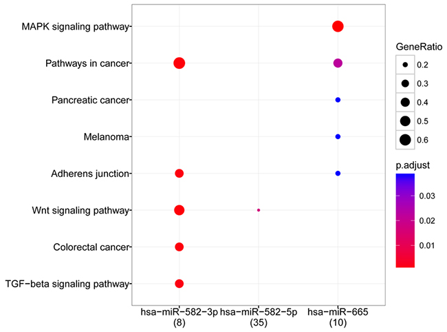 The 5 hub miRNAs were subjected to pathway enrichment analysis, which revealed enriched pathways for 3 hub miRNAs: hsa-miR-582-3p, hsa-miR-582-5p, and hsa-miR-665. Hsa-miR-582-3p and hsa-miR-665 were closely related to pathways in cancer. Target genes of hsa-miR-582-3p and hsa-miR-582-5p were greatly enriched in the Wnt signaling pathway. Other significant pathways were found to be MAPK signaling pathways related to hsa-miR-665, adherens junction, and TGF-beta signaling pathway related to hsa-miR-582-3p (Figure 4).