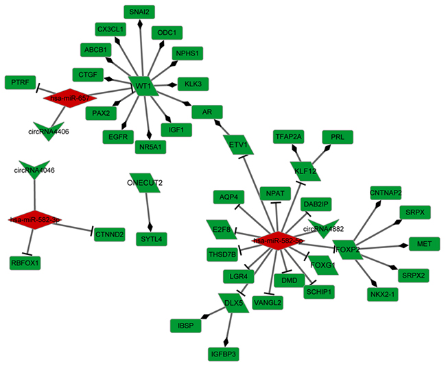 To further understand the role of the 3 significant miRNAs described above, miRNA target DE genes were subjected to the prediction of TF regulatory relationships revealed by the TRRUST database. We obtained 8 TFs (including DLX5 (distal-less homeobox 5), E2F8 (E2F transcription factor 8), ETV1 (ETS variant 1), FOXG1 (forkhead box G1), FOXP2 (forkhead box P2), KLF12 (Kruppel-like factor 12), ONECUT2 (one cut homeobox 2), and WT1 (Wilms tumor 1) among the 47 down-regulated genes in the ceRNA network (Figure 5). The TF regulatory network was constructed with 21 miRNA-target pairs and 23 TF-regulatory relationships. Three circRNAs (circRNA4046, circRNA4882, and circRNA4406) were included in the TF regulatory network as miRNA targets. Hsa-miR-657 target WT1 and hsa-miR-582-5p target ETV1 simultaneously regulated the AR gene.
