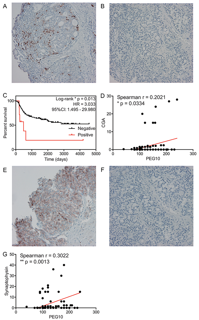 HRs were calculated using the Cox proportional hazard model, and significance was assessed using the log-rank test. The Kaplan-Meier method was used for survival analysis. The link between PEG10 and CGA or synaptophysin expression was assessed using the Spearman’s Rank-Order Correlation test. For multivariate analysis, Cox proportional hazard models were performed using the coxph function in the survival library in R. All other analyses were performed with GraphPad prism. Differences were considered statistically significant when the two-tailed p-value was <0.05.