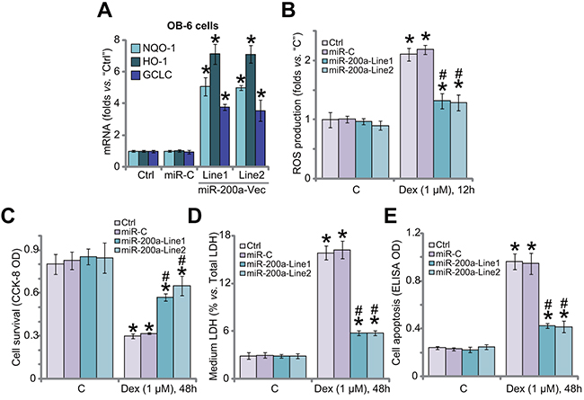 In the resting condition, Keap1 binds to Nrf2 to cause Nrf2 ubiquitination and degradation [30]. Above results have shown that miR-200a expression silenced Keap1 to cause Nrf2 stabilization and accumulation in OB-6 cells. We therefore tested Nrf2-dependent genes, including heme oxygenase-1 (HO1), NADPH quinone oxidoreductase 1 (NQO1) and glutamate cysteine ligase catalytic subunit (GCLC), in these cells. Quantitative real-time PCR (“qRT-PCR”) assay results in Figure 2A showed that mRNA expressions of the Nrf2 genes (HO1, NOQ1 and GCLC) were significantly increased in OB-6 cells expressing miR-200a, indicating Nrf2 signaling activation. We have previously shown that ROS production and oxidative stress are major contributors of Dex-induced osteoblast injuries [7-9, 11]. Nrf2 is the well-established and vital anti-oxidant signaling [19, 31-33]. Here, we showed that Dex-induced ROS production was largely attenuated after expression of miR-200a in OB-6 cells (Figure 2B). Remarkably, Dex-induced OB-6 cell viability reduction (CCK-8 OD/optic density, Figure 2C), cell death (LDH release, Figure 2D) and apoptosis (Histone DNA apoptosis ELISA OD, Figure 2E) were significantly alleviated in miR-200a-expressing cells. The non-sense microRNA-control (“miR-C”) failed to change Nrf2 signaling (Figure 2A), ROS production (Figure 2B) nor cell survival (Figure 2C–2E) in Dex-treated cells. Together, these results suggest that miR-200a expression activates Nrf2 cascade to inhibit oxidative stress, and protects OB-6 cells from Dex.