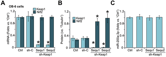 Figure 3: Keap1 shRNA induces Nrf2 stabilization in human osteoblastic cells. Stable OB-6 cells expressing Keap1 shRNA (sh-Keap1, “Sequ1/2”), non-sense control shRNA (“sh-C”), or the parental control cells (“Ctrl”) were subjected of qRT-PCR assay (A and C) and Western blotting assay (Data were quantified in (B), relative Keap1/Nrf2 expression and miR-200a-3p level were shown. Data were expressed as mean ± SD (n=5). * p <0.05 vs. “Ctrl”. Experiments in this figure were repeated three times, and similar results were obtained.