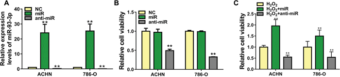 Figure 2: Effect of miR-93-3p on cell viability in vitro. miR-93-3p expression was quantified using qRT-PCR (A) and cell viability was determined via MTT assay (B and C) in ACHN and 786-O cells 48 h after transfection with miR-93-3p mimics, anti-miR-93-3p, or NC oligo. **P<0.001.