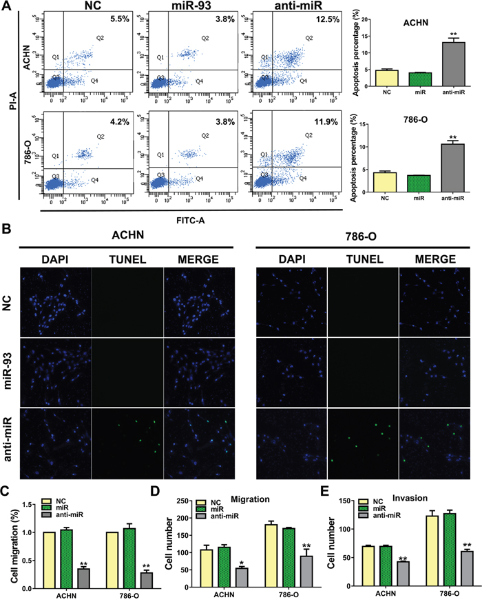 Figure 3: miR-93-3p suppresses ccRCC cell apoptosis and promotes migration. ACHN and 786-O cells were stained with Annexin V and PI, and apoptosis was analyzed via flow cytometry (A). 104 cells were detected per sample. Apoptosis was detected by TUNEL staining after transfection for 48 h (B). Apoptotic cells are green, and nuclei are stained blue with DAPI. Wound healing assay showing transfected cell migration (C). Wound widths were normalized to NC-transfected cells. Wound healing percentage was calculated as: (wound width at 0 h - wound width at 48 h) / wound width at 0 h. ACHN and 786-O cell transwell migration (D) and invasion assays (E). *P<0.05, **P<0.001.