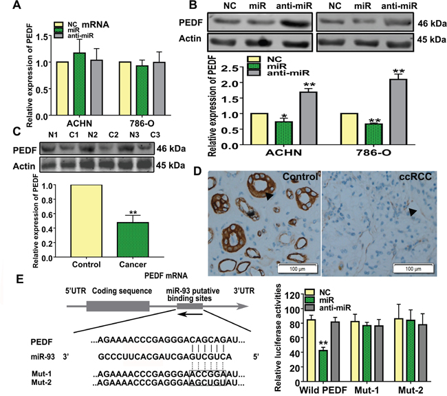 Figure 4: miR-93-3p directly targets PEDF. PEDF expression was measured using qRT-PCR (A) and western blotting (B) after NC, miR-93-3p, or anti-miR-93-3p transfection for 48 h in ACHN and 786-O cells. Actin was used as a loading control in western blots. Experiments were repeated at least three times with duplicate samples. PEDF levels were measured in ccRCC patient samples via western blotting (C). Photomicrographs showing representative hematoxylin and eosin staining and PEDF immunohistochemical analysis results in human ccRCC and normal kidney tissues (D). The potential interaction between miR-93-3p and putative binding sites in the PEDF 3’-UTR. NC, miR-93-3p, or anti-miR-93-3p were co-transfected with the wild type PEDF 3’-UTR, Mut1, or Mut2 into HEK293 cells for 48 h. Luciferase activities were analyzed relative to the NC-transfected group (E). Data were presented as means ± SEM. Experiments (C-E) were repeated six times each with duplicate samples. *P<0.05, **P<0.001.