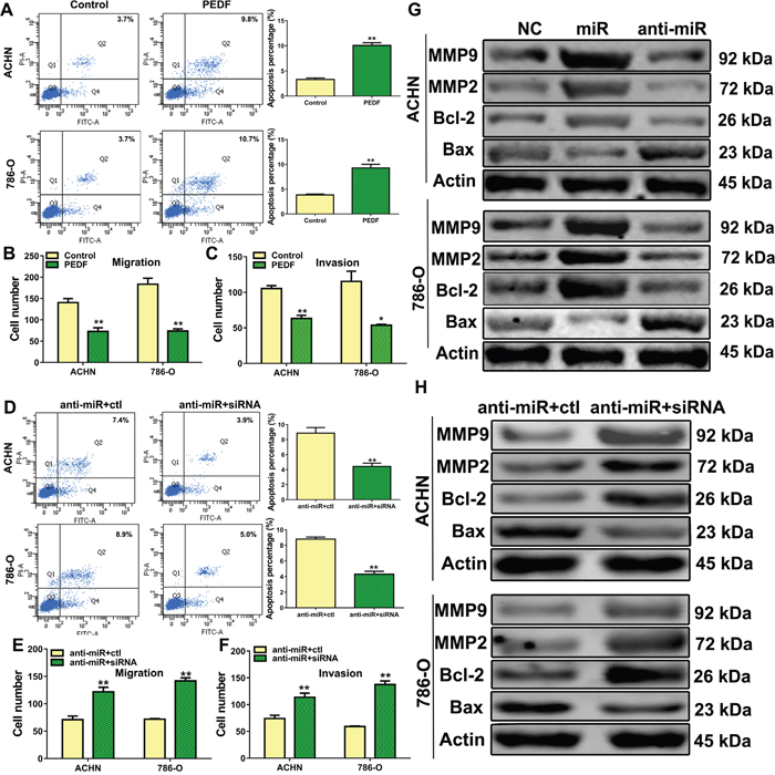 Figure 5: The role of PEDF in ccRCC cells. ACHN and 786-O cells were transfected with control or PEDF vector and stained with Annexin V and PI, and apoptosis was analyzed via flow cytometry (A), transwell migration (B) and invasion assays (C) were performed in PEDF-transfected cells. Cell apoptosis was analyzed via flow cytometry after PEDF siRNA was co-transfected with anti-miR-93-3p into ACHN and 786-O cells (D). Co-transfected ACHN and 786-O cell transwell migration (E) and invasion assays (F). Apoptosis-related proteins (G) and MMP2/9 (H) were analyzed. All experiments were repeated at least three times with duplicate samples.*P<0.05, **P<0.001.